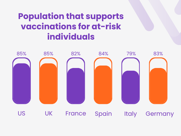 France shows 82% support, acknowledging the need despite rural skepticism linked to limited healthcare access, informal sources of information and traditional beliefs. Italy presents slightly lower support at 79%, driven by healthcare disparities and a history of skepticism in rural areas.