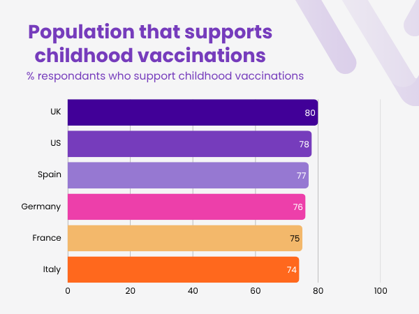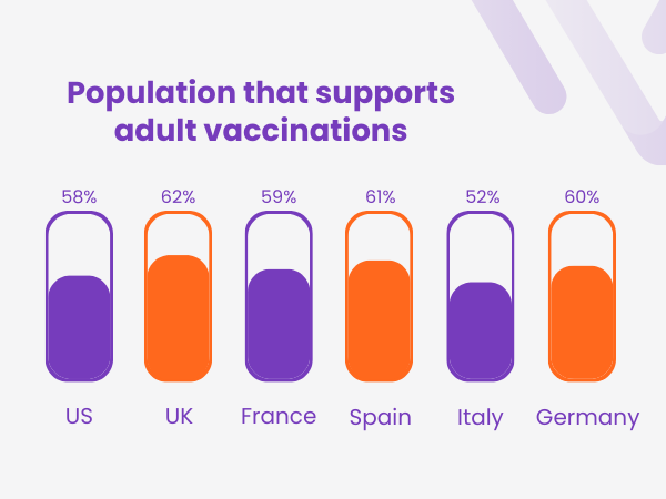 Childhood vaccinations receive strong support, with the UK (80%) leading due to successful past campaigns that eradicated diseases like measles. The US (78%) sees higher approval in urban areas with robust pediatric care. Spain (77%) and France (75%) maintain high levels of approval, supported by comprehensive childhood vaccination programs. Germany reports 76% support, aligned with trust in structured public health policies. Italy shows 74% approval, though adult vaccination hesitancy occasionally impacts discussions around broader immunization efforts.