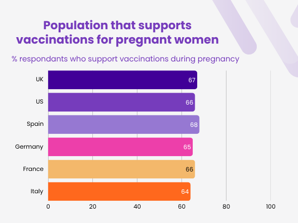 Opinions are significantly varied when it comes to vaccinating pregnant women. Spain leads with 68% support, thanks to targeted campaigns that stress maternal and infant health. In the US and France, around 66% of respondents support vaccination during pregnancy. In the US, cultural emphasis on bodily autonomy in rural areas contributes to hesitancy, while in France, media debates over long-term safety influence public sentiment. In the UK (67%), trust in health guidelines bolsters support despite some individual concerns. In contrast, Germany (65%) and Italy (64%) display lower support, reflecting broader concerns about transparency and long-term effects.