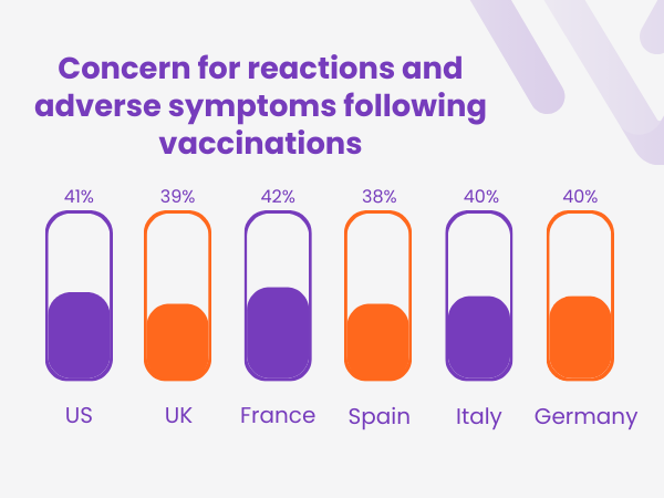 Reactions such as flu-like symptoms remain another prevalent issue. France reports the highest concern at 42%, underscoring public sensitivity to immediate side effects. In the US, 41% of respondents voiced apprehension, often influenced by anecdotal accounts shared through local media. Germany (40%) and Italy (40%) report similar levels, reflecting ongoing concerns about discomfort post-vaccination. The UK follows at 39%, where public reassurance campaigns have helped contain fears. Spain reports the lowest concern at 38%, supported by comprehensive post-vaccination care initiatives that reinforce public confidence.